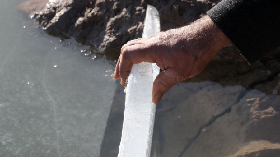 Durmuş Sağır, her sene gölet yüzeyinin buz tuttuğunu belirterek, "Burası Harmancık Göleti, 1992 yılında yapıldı. Kış geldi ama yağmur yok, kar yok. Geceleri hava sıcaklığı sıfırın altında 7 dereceye kadar düşüyor ama gün içerisinde hava güneşli ve sıcak. Yağmur, kar yok; kuruduk kaldık. Her sene bu gölün yüzeyi buz tutar ama bu sene biraz geç dondu. Havaların sıcak olmasından dolayı" dedi.
