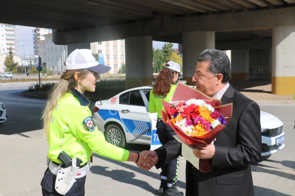 Sivas'ta yapımına başlanan Sivas-Erzincan kara yolu üzerinde bulunan Numune Hastanesi Farklı Seviyeli Kavşak inşaatı yaklaşık 5 aydır devam ediyor. Kavşak inşaatından dolayı Halil Rıfat Paşa Köprülü kavşağında trafik yoğunluğu yaşanıyor. Trafikte meydana gelen aksamaları önlemek adına trafik polisi memurları yoğun çaba göstererek çalışmalarına devam ediyorlar. Kadın polislerin yoğun çalışmalarından dolayı Halk Otobüsleri Kooperatif Başkanı Yasin Aslan ve Sivas Şoförler Cemiyeti Başkanı Şaban Yalman, özverili çalışmalarından dolayı kavşakta görev yapan kadın trafik polislere çiçek ve hediye vererek teşekkür etti.