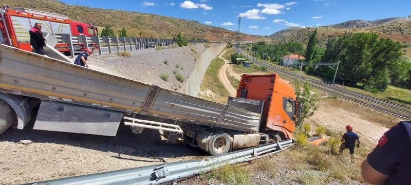 Edinilen bilgiye göre kaza Sivas Taşlıdere mevkiinde Yassıcabel köyü yakınlarında meydana geldi. D.S hâkimiyetinde ki 58 BG 680 plakalı beton blok yüklü tır, sürücüsünün direksiyon hakimiyetini kaybetmesi sonucunda virajı alamadı. Yol kenarında ki bariyerleri aşan tır şarampolde asılı kaldı. Kazayı gören vatandaşlar itfaiye, sağlık ve jandarma ekiplerine haber verdi. Olay yerine gelen ekipler yaralanan sürücüyü Sivas Cumhuriyet Üniversitesi Sağlık Hizmetleri Uygulama ve Araştırma Hastanesine kaldırdı. Kaza ile ilgili araştırma başlatıldı.(İHA)