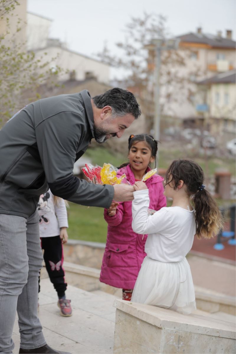 Sivas Şehit Aileleri ve Gazileri Sosyal Yardımlaşma Derneği Başkanı Fatih Deveci ve dernek üyeleri, 23 Nisan Ulusal Egemenlik ve Çocuk Bayramı dolaysıyla sokak ve parkları gezerek çocuklara bayrak ve Ramazan ayının vazgeçilmezi olan horoz şeker dağıttı.
