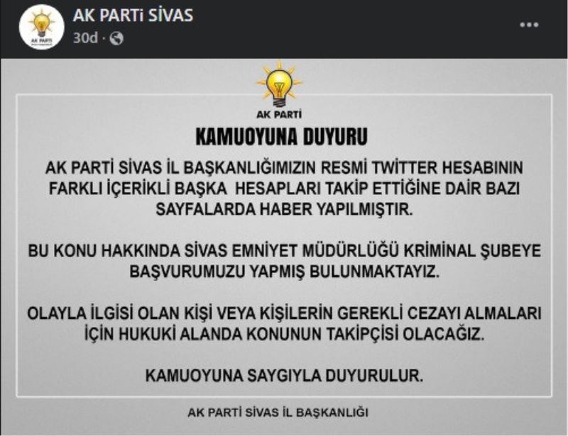 AK Parti Sivas İl Başkanlığı konuya ilişkin sosyal medya hesabından bir duyuru yaptı. Duyuruda şu ifadelere yer verildi: AK Parti Sivas İl Başkanlığımızın resmi twitter hesabının farklı içerikli başka hesapları takip ettiğine dair bazı sayfalarda haber yapılmıştır.