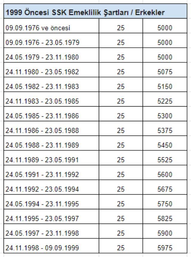 SSK'lı erkeklerin 1999 öncesi emeklilik için gereken sigortalılık süresi ve prim gün sayıları: