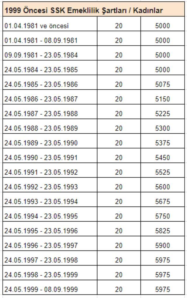 SSK'lı kadınların 1999 öncesi emeklilik için gereken sigortalılık süresi ve prim gün sayıları: