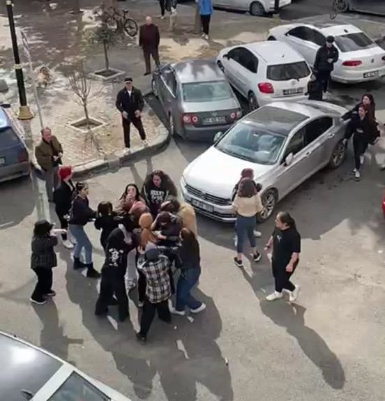 Sözlü tartışma kısa süre sonra kavgaya dönüştü. Bir anda ortalık savaş alanına döndü. Kızların birbirinin saçlarını çekmesi ve tekme atması cep telefonu kamerası ile kaydedildi.(İHA)