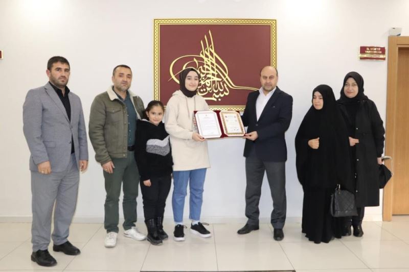 Hafızlık belgesini almak için ailesiyle birlikte Sivas İl Müftülüğünü ziyaret eden Hafız Duman'ın belgesini İl Müftü Yardımcısı Muttalip Karataş teslim etti.(İHA)
