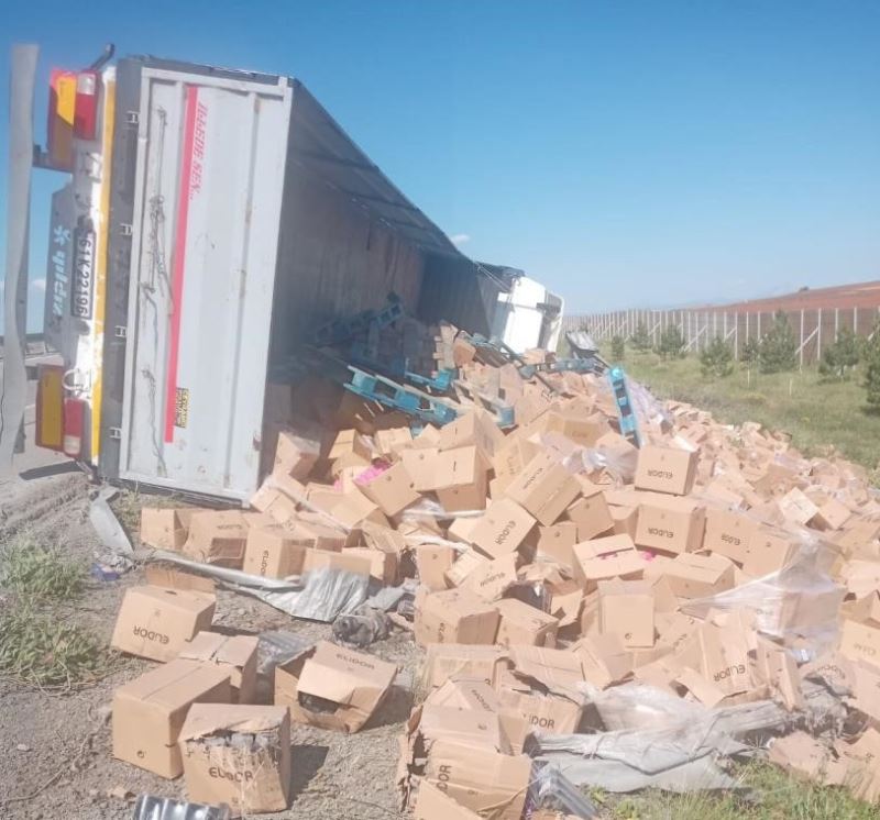 Sivas’ta temizlik malzemesi yüklü tır şarampole devrildi, yaralanan tır sürücüsü hastaneye kaldırıldı.