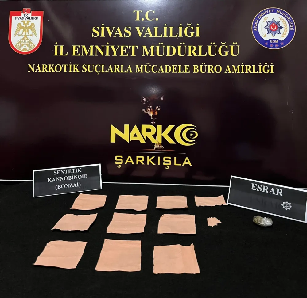 Sivas İl Emniyet Müdürlüğü Narkotik Suçlarla Mücadele Şube Müdürlüğü ekipleri Sivas ve Şarkışla ilçesinde uyuşturucu operasyonu düzenledi. Uyuşturucu madde ticareti ve kullanımının engellenmesine yönelik yürütülen operasyonda; Şarkışla ilçesinde D-260 karayolu üzerinde bir araç durduruldu. Durdurulan araçta ve araçta bulunan 2 şahıs üzerinde yapılan aramada; 11 adet kâğıt peçeteye emdirilmiş toplamda 3 bin 342 adet kullanımlık sentetik kannabinoid maddesi, 1 adet plastik naylon içerisinde daralı ağırlığı 2,14 gram olan esrar maddesi ele geçirildi. Sivas’ta ise düzenlenen operasyonda şehirlerarası yolcu otobüsünden inen iki şahsın üzerinde arama yapıldı. Yapılan aramada şahısların üzerinden,7 adet kağıda emdirilmiş vaziyette toplamda 2 bin 128 kullanımlık sentetik kannabinoid maddesi ele geçirildi. İki ayrı operasyon sonucunda yakalanan 4 şahıs uyuşturucu ve uyarıcı madde imal ve ticareti, madde kullanmak için uyuşturucu veya uyarıcı madde satın almak, kabul etmek veya bulundurmak ya da uyuşturucu veya uyarıcı madde kullanmak suçları çerçevesinde işlem yapılmış, şahıslar adli işlemlerinin ardından tutuklanarak cezaevine teslim edilmiştir.