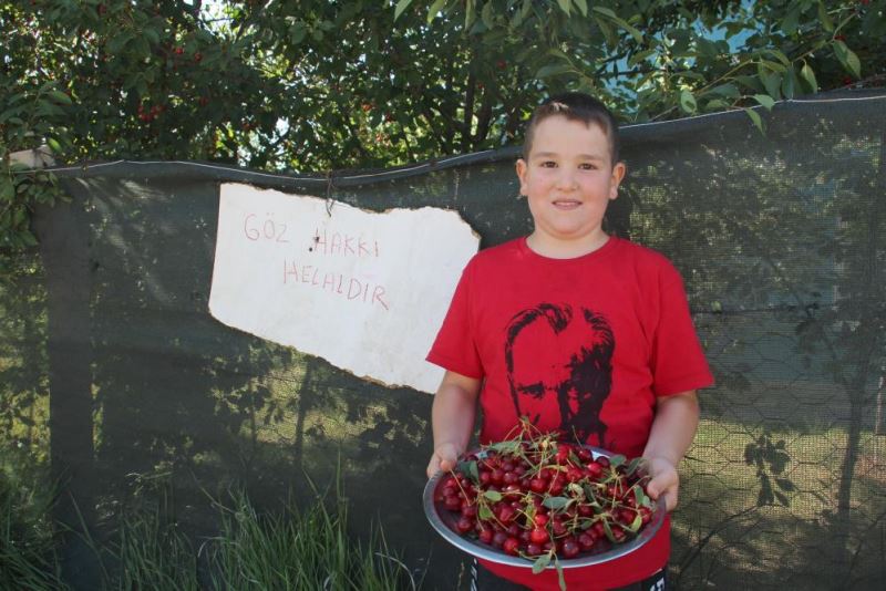Kent merkezi Karşıyaka mahallesinde yaşayan Ahmet Hakan Koçak (9), yoldan geçen vatandaşların bahçelerinde bulunan vişneyi görünce canlarının çektiğini düşünerek kolları sıvadı. Ailesinin de desteğini alan Koçak, ağaçtan vişne koparıp yemek için tereddüt yaşayan vatandaşlar için ‘Göz hakkı helaldir’ yazısı yazdı. Koçak, tahta parçasına yazdığı yazıyı evlerinin bahçesinde bulunan çite astı. Yazıyı görenin gönül rahatlığıyla vişne yemeğe geldiğini belirten Koçak, mutlu olduğunu ifade etti.